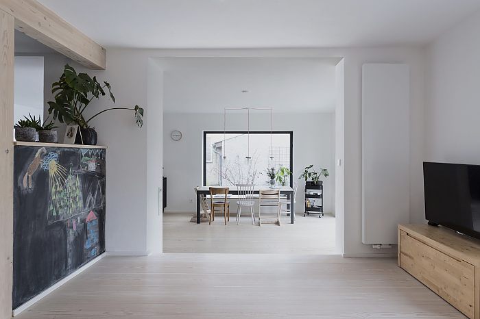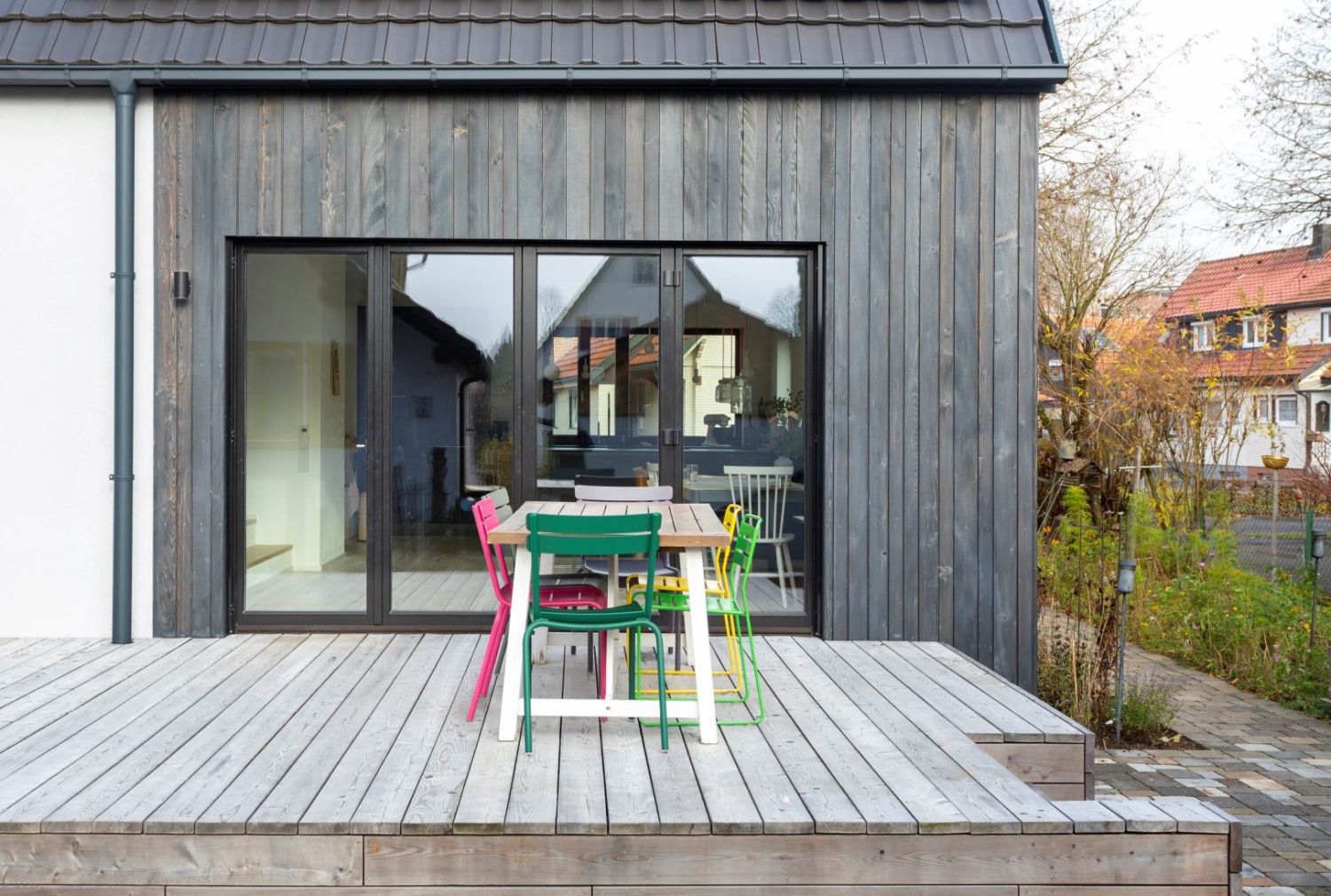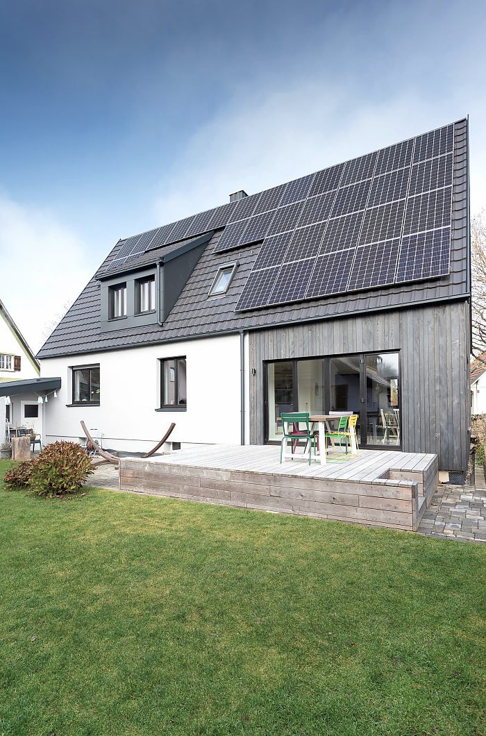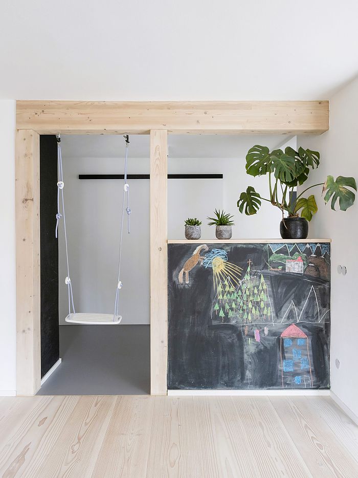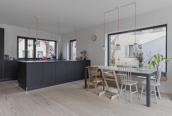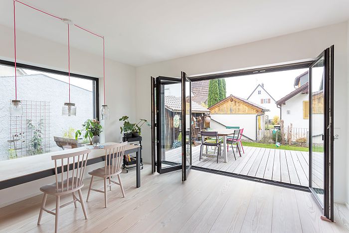 Konsequent wurde der Baukörper in Holzbauweise in gleicher Kubatur verlängert und fügt sich somit in die bestehende Siedlungsstruktur ein. Durch den Kontrastwechsel ist der neue Baukörper innen wie außen ablesbar. Die hochwertigen Materialien wie die Holz-Alu-Fenster, Bodenbeläge oder Einbauten wurden sorgfältig aufeinander abgestimmt. Die durchdacht gesetzten Fensteröffnungen stellen einen starken Bezug zum Außenraum her, der dadurch neue Qualitäten erhält.