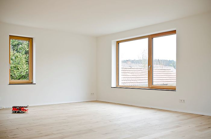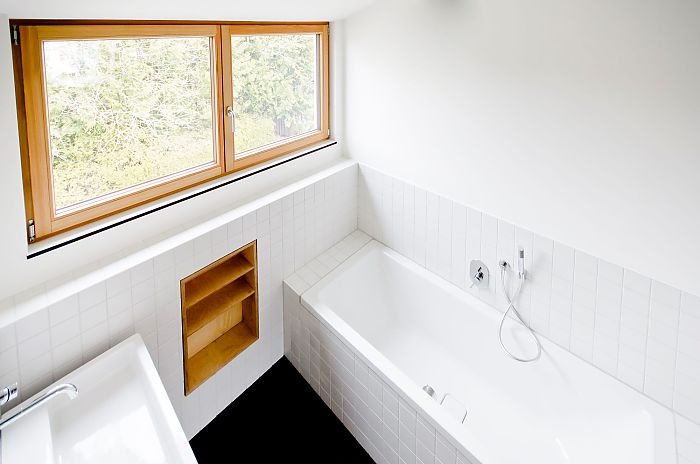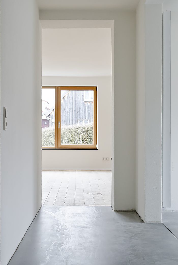 Der Charme des Hauses wird erhalten, Innenräume und Ausblicke behutsam umgestaltet. Im Ergeschoß werden großzügige Wohnräume geschaffen, die direkt mit dem Garten verbunden sind. Wenige Materialien, wie geölte Eiche Massivdielen und ein Sichtestrich in Kombination mit glatt verputzten Wänden, charakterisieren die Innenräume.