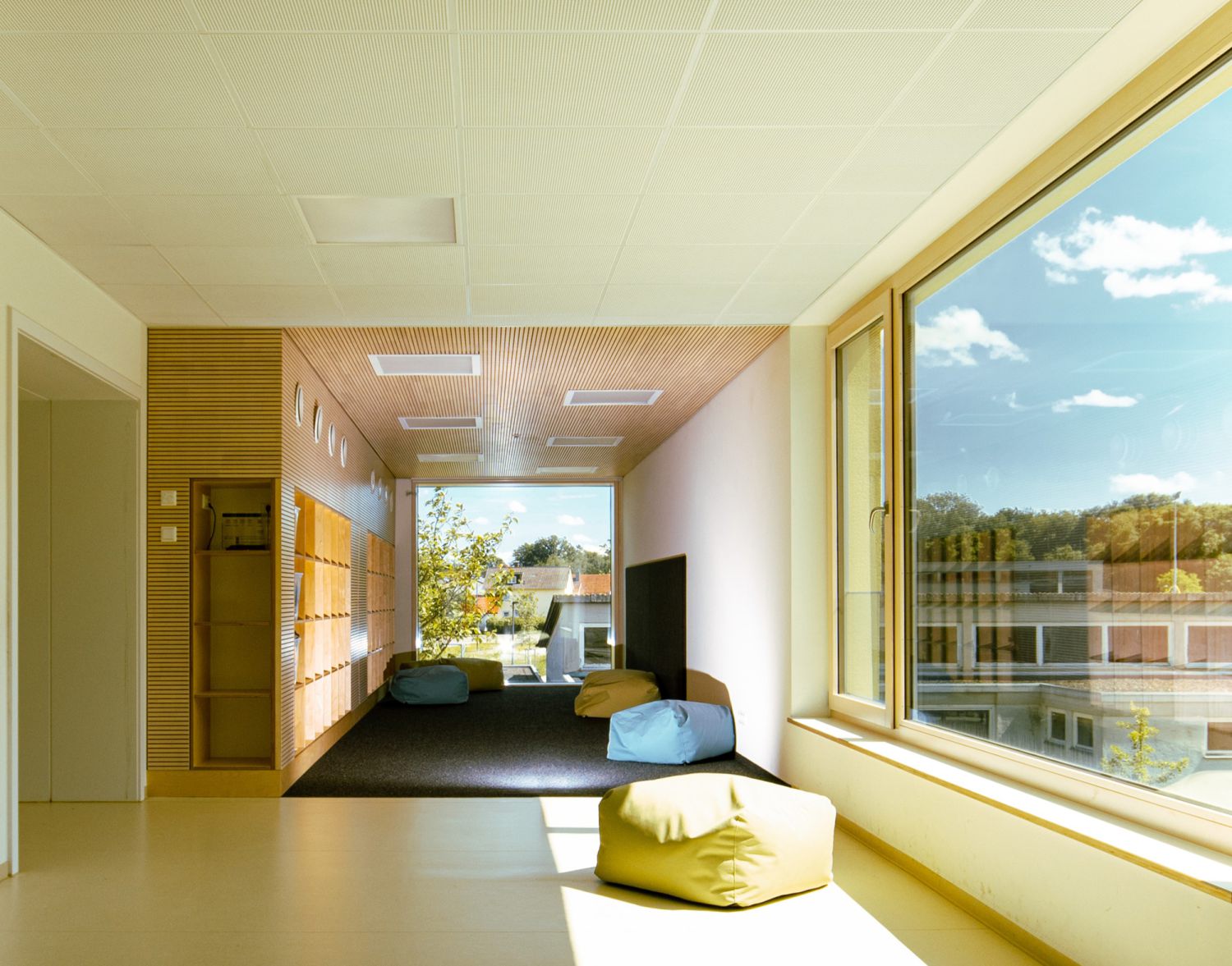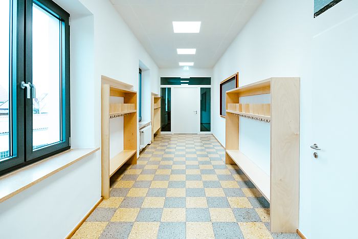 Den Bestand zu erhalten, war dabei nicht nur eine Frage der Wirtschaftlichkeit, sondern auch der Nachhaltigkeit. Lediglich ein nicht mehr genutzter kleiner Baukörper wurde rückgebaut, stattdessen verbindet nun ein schlanker Baukörper die Bestandsgebäude, sodass alle Lern- und Erlebnisräume im Obergeschoss miteinander verbunden sind.