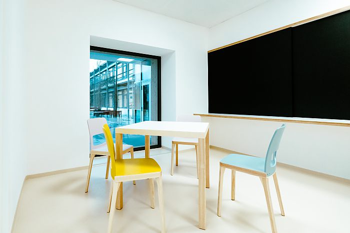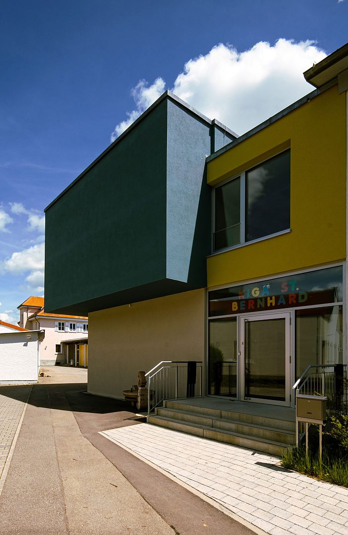 Der neue Verbindungsbau nimmt weiter den Eingang der Kinderkrippe auf, die sich nach Westen erstreckt, ergänzt um einen kleinkindgerecht gestalteten Gartenbereich.