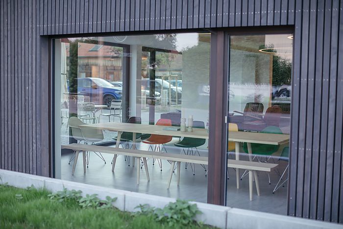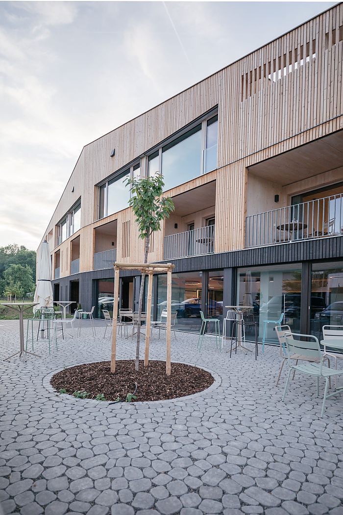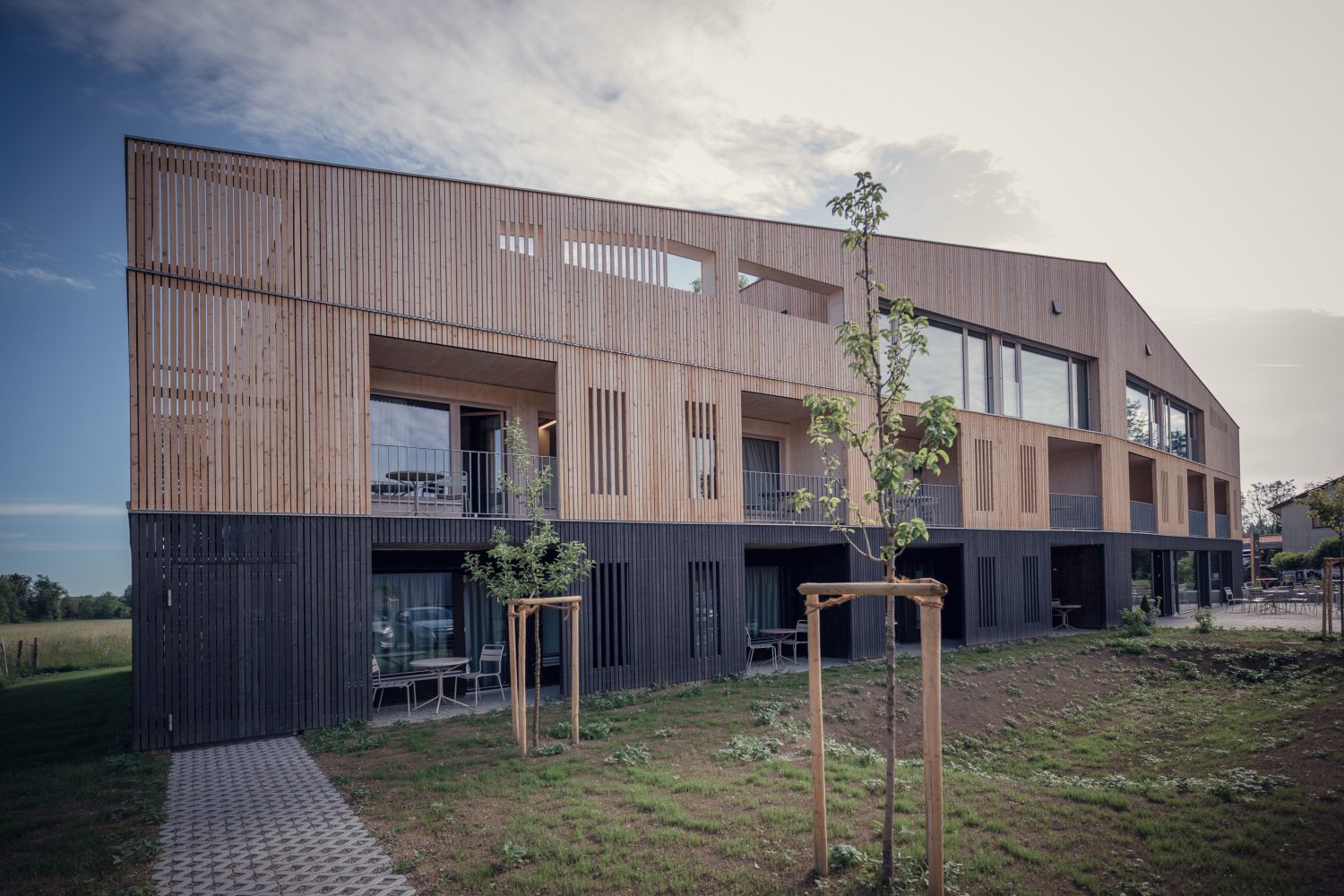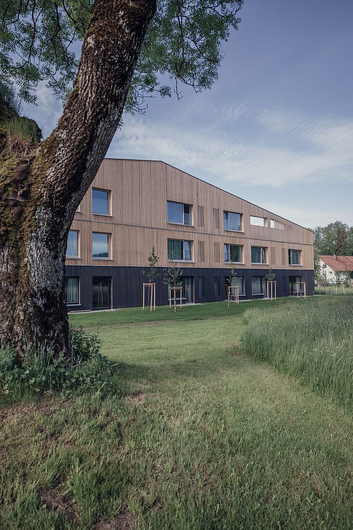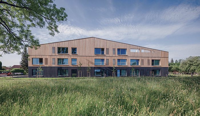 Das Gebäude aus Massivholz zeigt seine Konstruktion auch an der konsequenten Umsetzung der Holzfassade, die natürlich vergrauen wird und mit dem Sockelgeschoss ein harmonisches Bild ergibt.