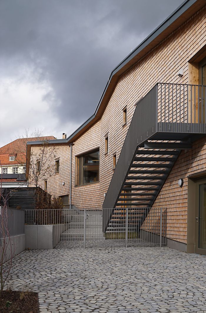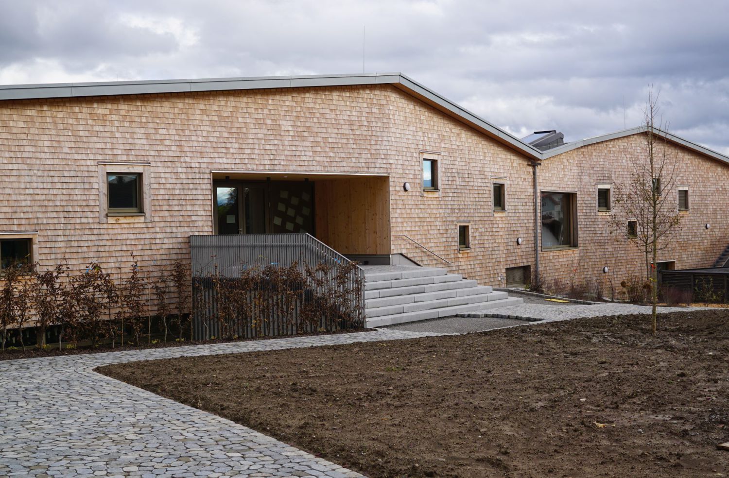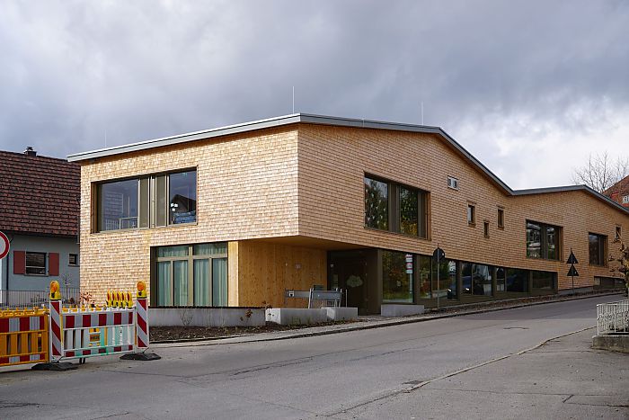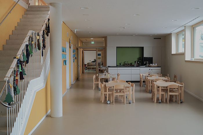 Die innere rechtwinklige Struktur mit der Treppe als Rückgrat strukturiert das Gebäude. Die klare Zuordnung mit den Gemeinschaftsbereichen im Erdgeschoß und den Gruppenräumen im Obergeschoß ermöglicht eine einfache Orientierung. Ein Schrägdach als gefaltetes Dachelement schließt den Baukörper ab und bindet ihn in die vorhandene Umgebung ein.