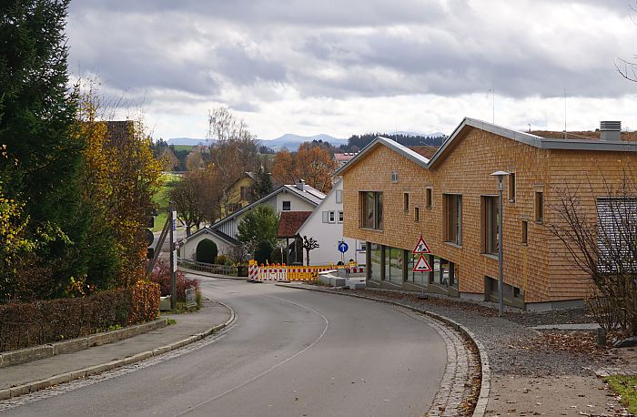 Eine geschlossene Verkleidung aus unbehandelten Holzschindeln, die den gesamten Bau umschließt, gibt dem Gebäude ein angemessenes Erscheinungsbild für seine Lage in dem ländlichen Ortskern von Eisenharz.