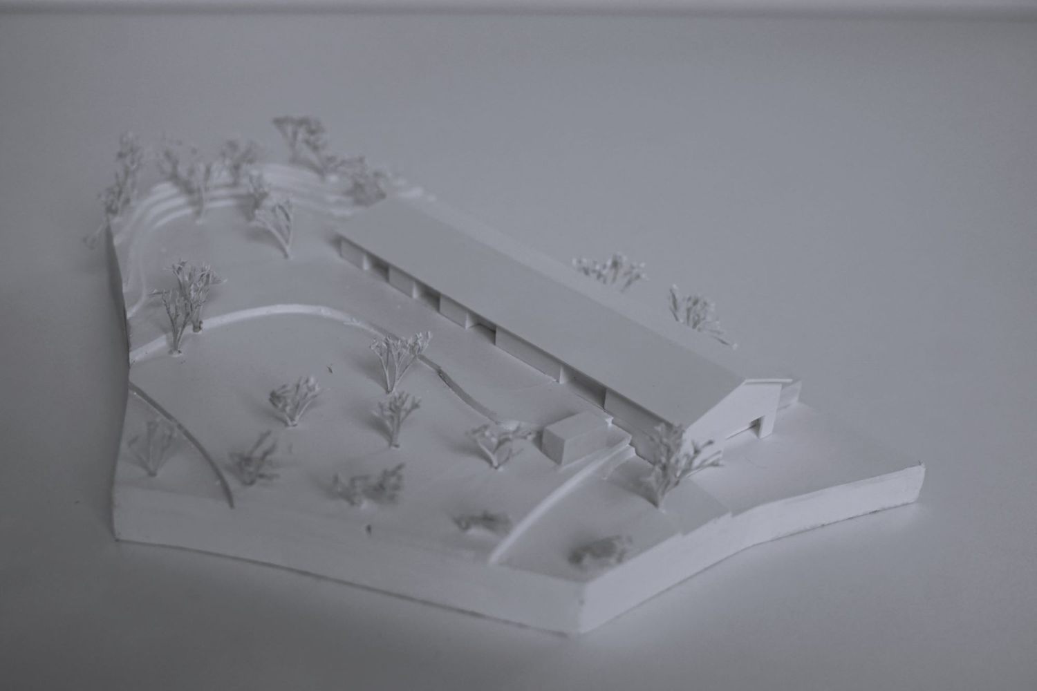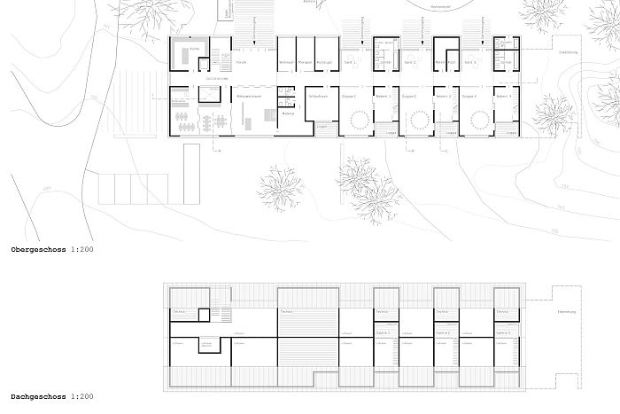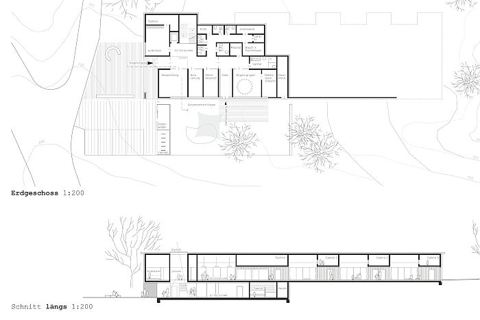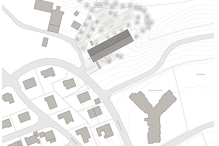 Das Gebäude wird als langer Baukörper am Übergang des Plateaus zu dem Hang entlang des Geländeverlaufs platziert. Die "Hoflinde" sowie der bestehende Kindergarten (während der Bauphase) können so erhalten bleiben. Es entstehen ebene Außenbereiche zwischen dem Baukörper und dem künstlichen nördlichen Hang und ein kleiner Freibereich im Südwesten.