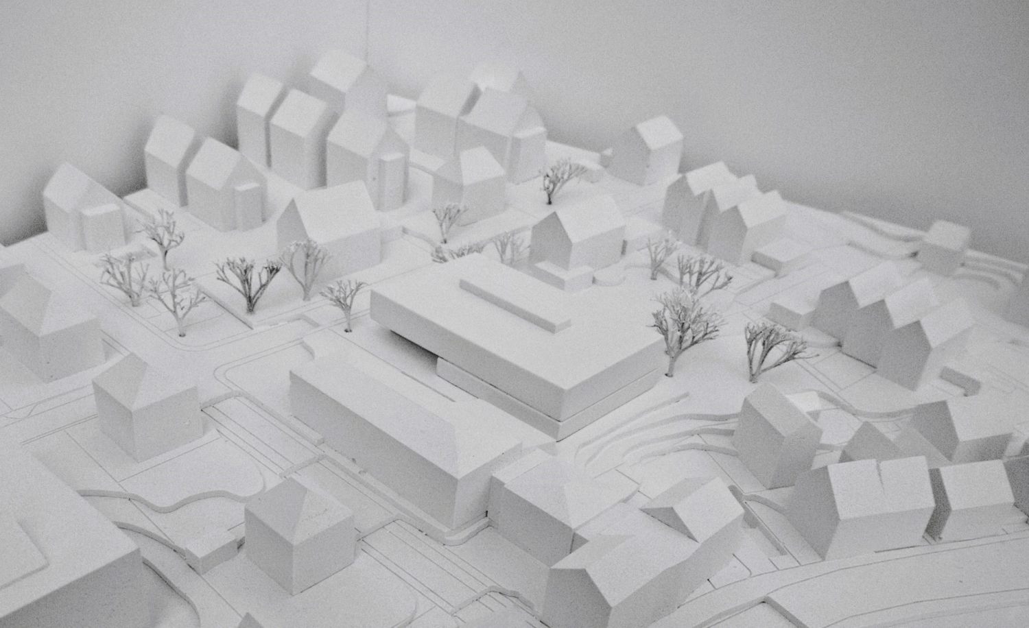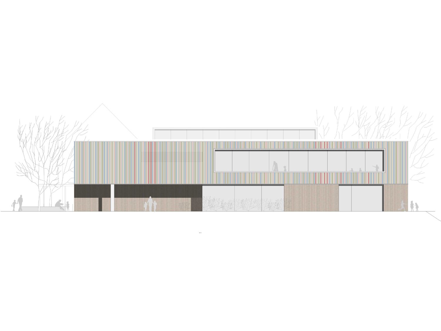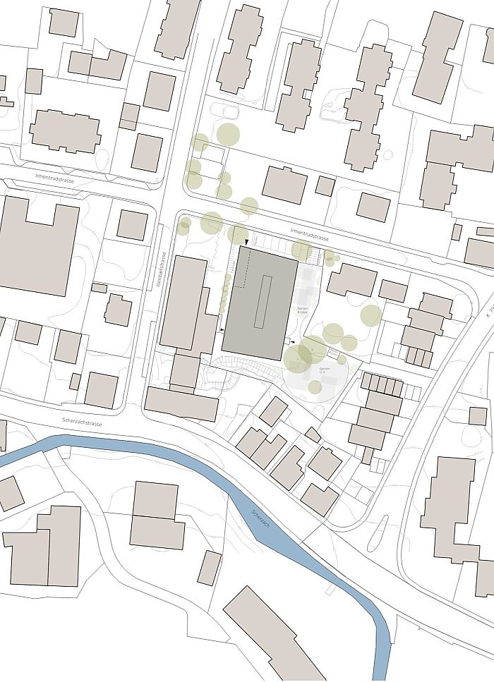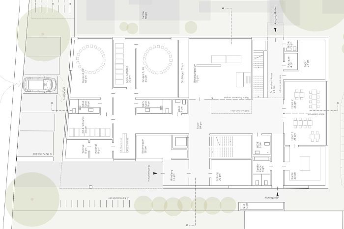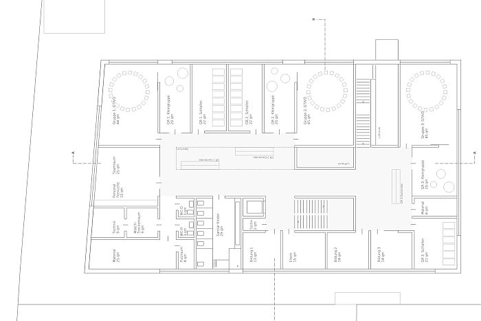 Auszug Beurteilung Preisgericht: "Die Aufgabe, ein sehr großes Raumprogramm auf dem Grundstück anzuordnen, wird durch einen 2-geschossigen Baukörper gelöst, der den überbaubaren Grundstücksbereich nahezu vollständig in Anspruch nimmt. Diese erst einmal nicht naheliegende Lösung schafft Raum für eine sehr entspannte Grundriss-Disposition, die auf die Umgebung überraschend flexibel reagiert. Der Haupteingang ist an der Nordwest-Ecke des Grundstückes richtig platziert und über einen Gebäudeeinschnitt unprätentiös markiert. Damit wird erreicht, dass das Gebäude sehr zentral betreten wird und eine übersichtliche Erschließungssituation über einen foyerartigen Mittelflur entsteht. Diese großzügige Erschließungsfläche ermöglicht auf beiden Geschossen eine vielfältige Bespielung. Ein Luftraum und das Oberlicht steigern die innenräumliche Qualität und die Wahrnehmbarkeit des Kindergartens als „ein Haus“..."