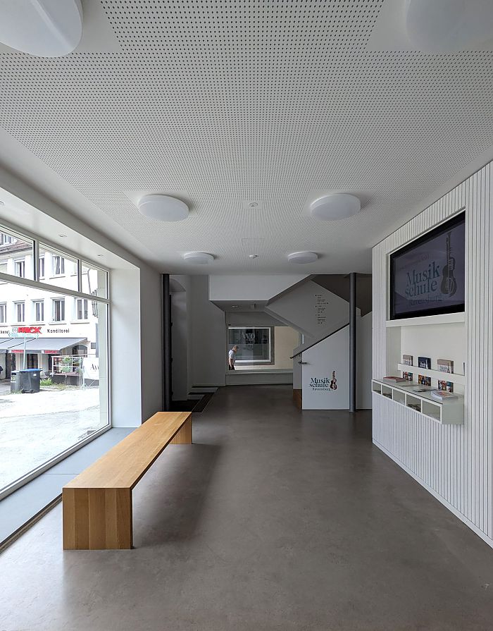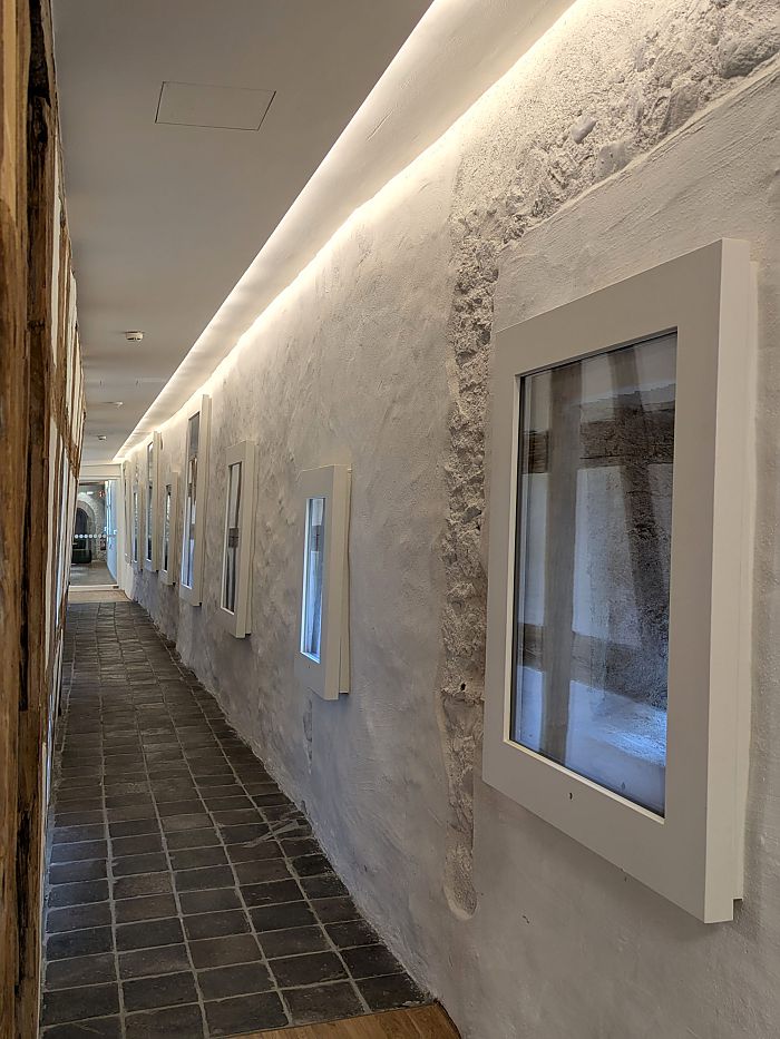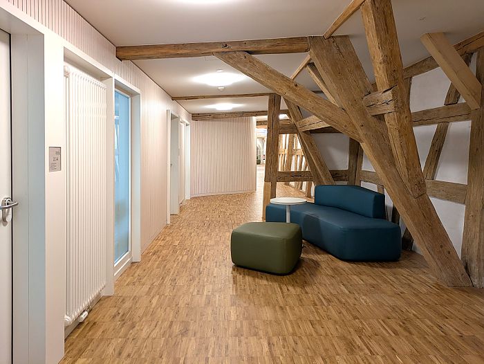 Sämtliche denkmalpflegerisch nicht relevanten Einbauten werden entfernt. Das vorhandene Holz-Stahl Tragwerk wird an die neuen Anforderungen angepasst und grundlegend denkmalgerecht saniert. Die Raumstruktur wird unter Berücksichtigung der Substanz neu entwickelt. Hierbei werden die ältesten Bauteile, wie Stadtmauer und Wehrgang möglichst freigespielt und erlebbar gemacht. Neben den 24 Unterrichtsräumen werden ein kleines Foyer, Verwaltungsräume und ein Vortragssaal im Dachgeschoss geschaffen. Der Innenausbau erfolgt gemäß der Schall- und Brandschutzanforderungen in Trockenbau und Holz.